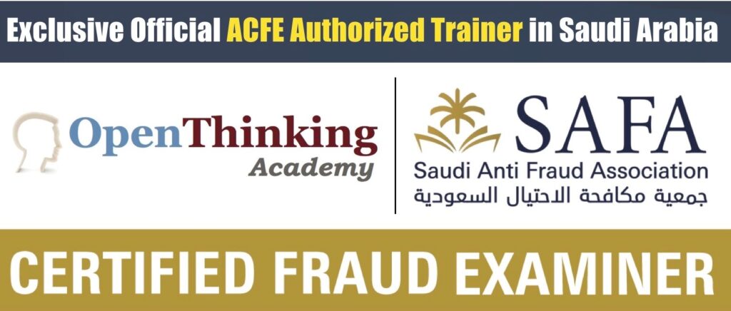 تسعد جمعية مكافحة الاحتيال السعودية وبشراكة مع أكاديمية أوبنثنكنق إننا الجهة الوحيدة في المملكة العربية السعودية والمصرحة لتدريب أختبار شهادة محقق احتيال معتمد من جمعية محققي الاحتيال الدولية. ولذالك ندعوكم لحضور دورة تدريبية افتراضية و حضورية